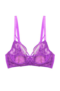 Inject a pulse raising jolt of provocative purple into your lingerie collection with the 'Rosanna Purple Long Line Plunge Bra'. Designed for those with a fuller bust and the perfect blend of playful femininity, this underwire plunge bra features sensuously sheer mesh cups and a longline bridge overlaid with delicate floral embroidery, which is offset with bust enhancing harness straps. Adjustable shoulder straps lead to a hook and eye fastening back.