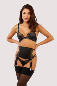 The power combination of satin, lace, and mesh.. introducing the Wren Black Illusion Mesh and Satin Waspie. Featuring a beautiful satin centre with intricate lace detaling, and transparent mesh sides. This stunning piece creates a barely there illusion whilst also providing support. The perfect final touch to the whole set.
