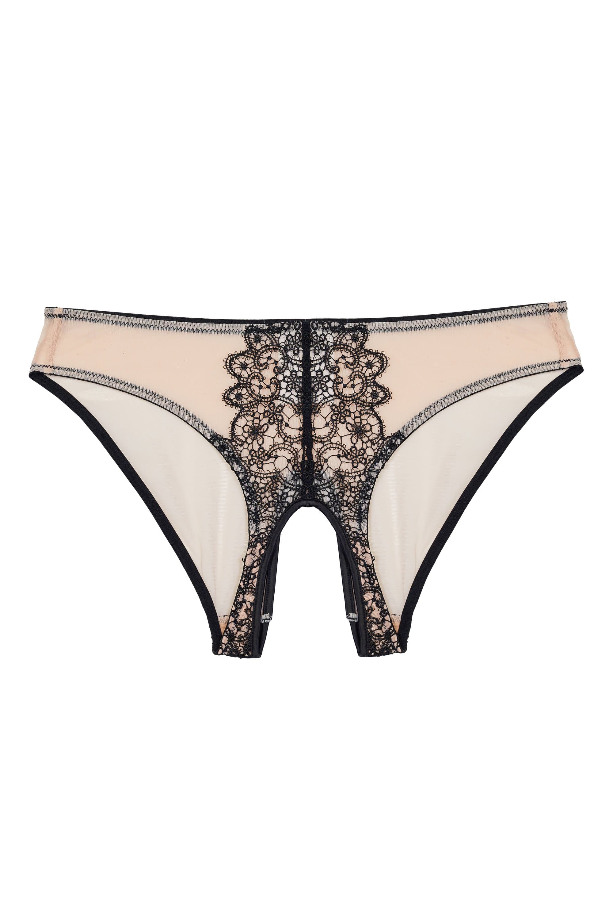 Make a stunning entrance in the Anaise Ouvert Briefs, with sheer peach mesh and soft lace black detailing with a crotchless feature. Finished with satin trim, style with the matching lingerie for a set like no other.