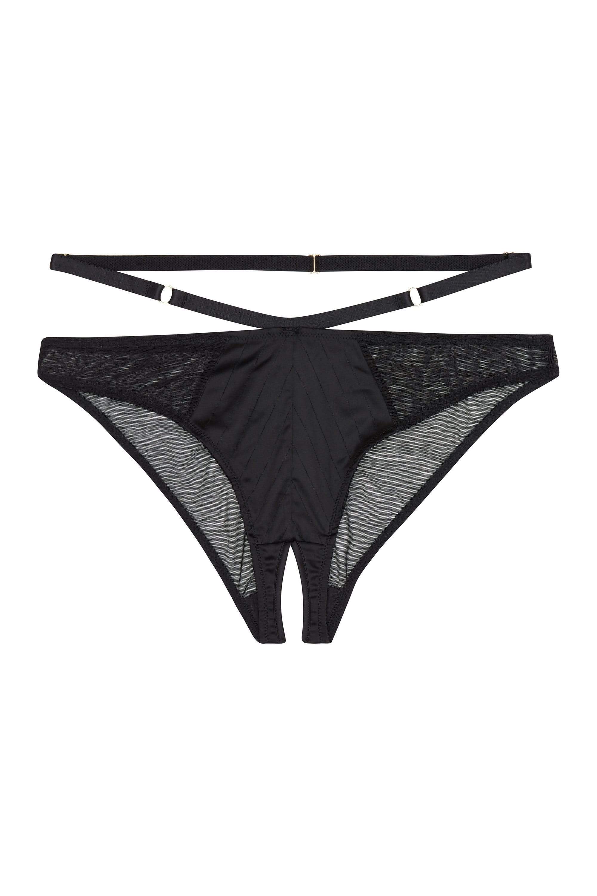 Simple, sophisticated, and highly erotic, the Sacha brief in sleek black satin features stitching on the centre panel for contoured, retro effect. The harness sits over the hips, making this set a boudoir essential. The brief features an ouvert cut out at the gusset for easy access!